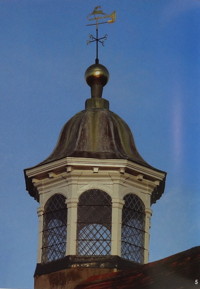 A1) Standing near the red phone box, can you spot this ‘cupola’ on top of the College of Matrons? A2) Why might it be called a ‘lantern’? A3) What does the weather vane on the very top tell you? A4) Look at the round window to the right. How many other round or oval windows can you count around the Green? |